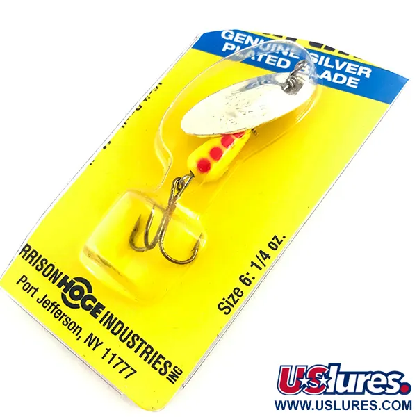 Tämä klassinen koon 6 lippa painaa 1/4 oz (7 g), ja siinä on Panther Martinille ominainen lehtirakenne suoraan akselilla, mikä mahdollistaa välittömän pyörimisen. Keltainen pisaranmuotoinen runko on koristeltu kolmella punaisella täplällä, mikä on ollut taimenen- ja ahvenkalastajien perusväri jo vuosikymmenien ajan. Aito hopeoitu lehti on poikkeuksellisen kovera, jotta se voidaan asentaa suoraan 5 cm:n (2") metalliakseliin ilman hakoja. Tämä tuotekoodilla 4581 tunnistettu yksilö on säilytetty alkuperäisessä Harrison-Hoge Industriesin pakkauksessa Port Jeffersonista, New Yorkista. Dominikaanisessa tasavallassa valmistettu viehe on luokiteltu kuntoon 6 ja se on käyttämätön alkuperäisessä pakkauksessaan. Painotettu runko on suunniteltu erityisesti helpottamaan heittopituutta sekä seisovassa että virtaavassa vedessä.