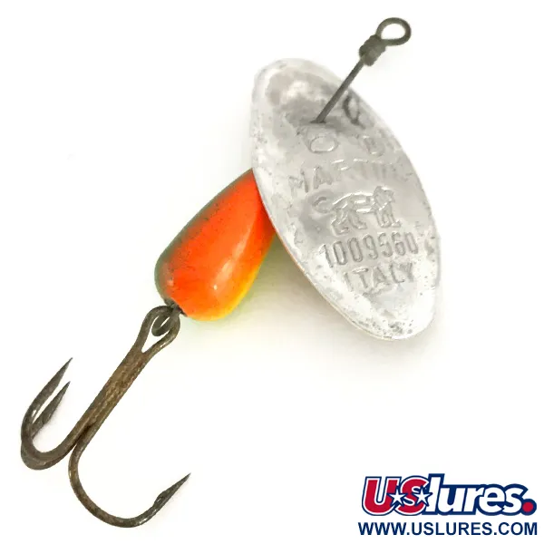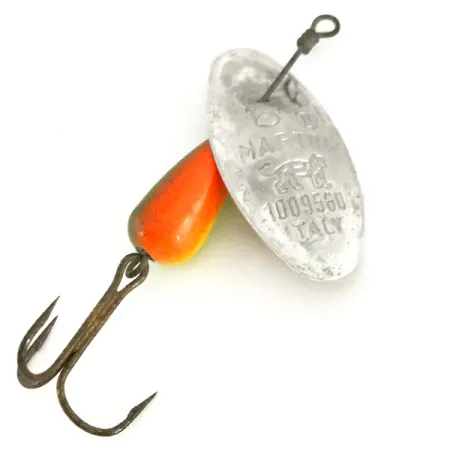 Hopeisen lehden kuperalle puolelle on selkeästi leimattu alkuperämaa ”ITALY” ja patenttinumero 1009560, mikä tekee tästä Panther Martin 6 -lipasta aiton palan eurooppalaista kalastushistoriaa. Painoltaan 6 g ja pituudeltaan 5 cm olevassa yksilössä on klassinen pisaranmuotoinen runko, jossa on eloisa punaisen ja oranssin liukuväri vihreällä pohjalla. Tässä erityisessä rakenteessa lehti on kiinnitetty suoraan akseliin, mikä mahdollistaa laajemman pyörimiskehän ja luo voimakasta värinää kelauksen aikana. Varustuksena on tukeva kolmihaarakoukku, jossa on lieviä ikääntymisen merkkejä, mutta se on edelleen täysin käyttökuntoinen. Kuntoarviolla 4/5 uistin on hienossa kunnossa, ja siinä on vain vähäistä pintakulumaa, joka korostaa sen vintage-luonnetta. Hopeiseen lehteen on pakotettu tunnistettava hyppäävän kissapedon logo, joka osoittaa sen kuuluvan 7707-sarjaan. Painotettu pisararunko on suunniteltu jakamaan massa tasaisesti pitkiä ja tarkkoja heittoja varten ahtaisiin kohtiin.
