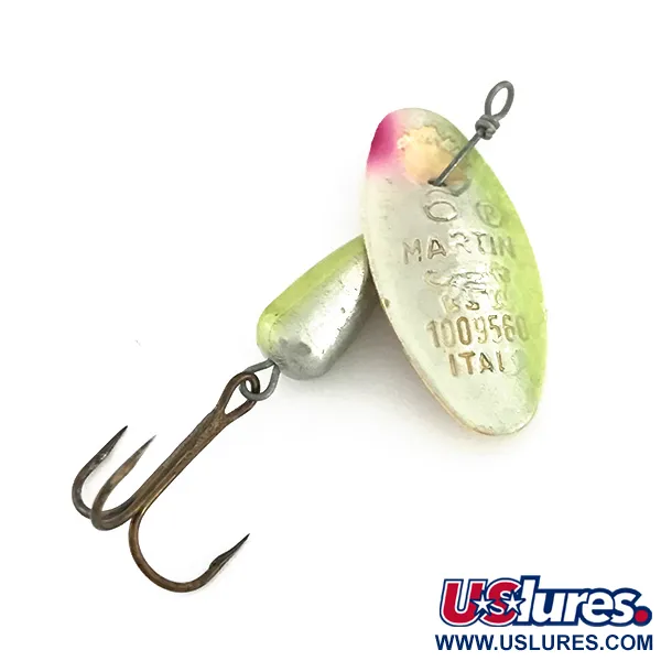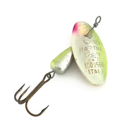 Hopeisen lehden metalliin on selvästi lyöty ”ITALY”-merkintä, mikä on osoitus tämän klassisen Panther Martin 6 -lipan eurooppalaisesta käsityötaidosta. Tämä 6 g (3/16 oz) painava ja 5,5 cm (2 1/4") pitkä lippauistin on varustettu erityisellä värikuviolla, jossa yhdistyvät hopeinen pohja, chartreuse-sävytys ja erottuva vaaleanpunainen kärki. Pisaranmuotoinen runko, joka on suunniteltu painon jakautumiseen heitossa, on viimeistelty yhteensopivilla chartreuse- ja hopeasävyillä. Tämän mallin (tuotekoodi 8537) merkittävä tekninen ominaisuus on suoraan runkolankaan ilman sankaa kiinnitetty lehti, mikä määrää kiinteän pyörimisakselin langan ympärillä. Koukkuna on tummapintainen kolmihaarakoukku. Tämä yksilö on 5/5-kunnossa, ja siinä on tallella alkuperäinen maali sekä selkeät leimat, mukaan lukien tunniste 1009560 lehden pinnassa.
