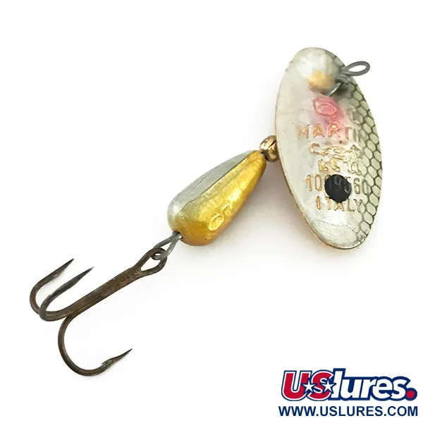 Tämä malli, jonka lehteen on leimattu "Italy", osoittaa sitä ammattitaitoa, joka on luonut Panther Martin -brändin maineen. Tämä koon 6 lippa painaa 3/16oz (6g) ja on pituudeltaan 2 1/4" (5,5cm). Siinä on ikoninen lehti suoraan akselilla -rakenne, joka mahdollistaa pyörimisen ilman sankaa. Lehden viimeistely on erityisen silmiinpistävä: toisella puolella on hopeinen hunajakennokuvio ja hienovarainen sateenkaaren sävy lähellä lenkkiä, kun taas kääntöpuoli on sileää kultaista kiiltoa. Pisaranmuotoinen runko on viimeistelty kaksiväriseksi, hopeiseksi yläosaksi ja kultaiseksi alaosaksi. Tuotekoodilla 8539 tunnistettu viehe on varustettu siistillä kolmihaarakoukulla ja siinä ei ole juurikaan kulumisen merkkejä, vastaten kuntoluokitusta 5/5. Keräilijät arvostavat selkeitä stanssauksia, kuten hopeisella puolella näkyviä tekstejä "MARTIN" ja "ITALY". Kokonaisuus on jämäkkä ja runkolanka on suora, mikä on tyypillistä näille Italiassa valmistetuille malleille, jotka on suunniteltu tarkkaan heittämiseen taimenpuroilla tai pienillä joilla.