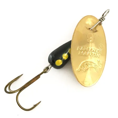 Tämä Italiassa valmistettu 1/3 unssin (9 g) painoinen lippa on klassinen malli, jonka keräilijät ja kalastajat tunnistavat sen erityisestä painotetusta rakenteesta. Kultapinnoitettuun lehteen on lyöty syvälle ikoninen Panther Martin -nimi, numero 9 ja hyppivä kalalogo, mikä vahvistaa sen alkuperän. Kokonaispituudeltaan 5,5 cm (2 1/4") vieheessä on pisaranmuotoinen musta runko, jossa on kolme erottuvaa keltaista pistettä. Tämä tuotekoodilla 6405 tunnistettu yksilö on käyttämätön, ja kaikki metallipinnat ovat kirkkaat ja puhtaat. Rakenteessa käytetään akselin läpi kulkevaa lehden kiinnitystä perinteisen sangan sijaan, mikä pitää profiilin kompaktina heittämistä varten. Pronssinvärinen kolmihaarakoukku on kiinnitetty tukevasti lankajärjestelmään, jonka solmukohta on viimeistelty tarkalla ja ammattimaisella punoksella.