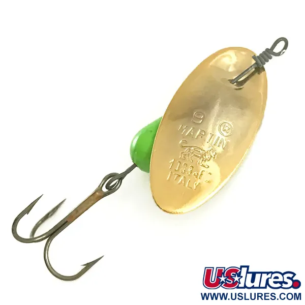 Kultapintaiseen lippaan on selkeästi meistetty numero "9", merkki "MARTIN" ja erottuva tiikerilogo alkuperämerkinnän "ITALY" yläpuolelle. Tämä 9 g (1/3 oz) painava ja 5,5 cm (2 1/4") pitkä viehe edustaa klassista inline-rakennetta, joka toi valmistajalleen mainetta. Pisaranmuotoinen runko on maalattu tasaiseksi vihreäksi, ja pieni kullanvärinen helmi erottaa rungon lipan pyörimispisteestä. Tuotekoodilla 6596 tunnistettava yksilö on käyttämätön, ja siinä on italialaiselle tuotannolle tyypilliset puhtaat linjat ja tarkat meistokset. Varustukseen kuuluu kestävä lanka-akseli ja terävä kolmihaarakoukku.