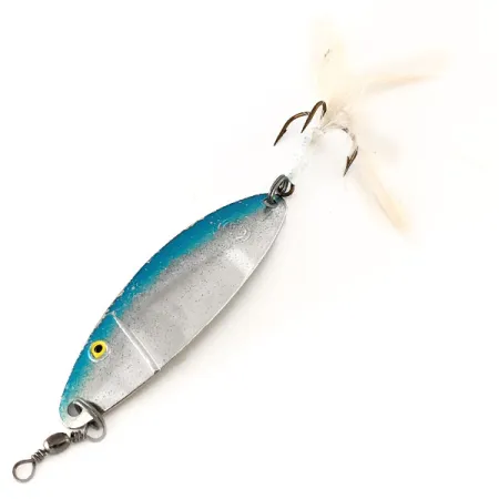 Siniset ja hopeiset sävyt määrittelevät tämän Italiassa valmistetun lusikkauistimen rungon, joka painaa 7 g. Tuotekoodilla 11205 varustettu Cucchiaino Ondulante Lugano edustaa Panther Martinille ominaista korkeaa valmistuslaatua. Runkoon on maalattu selkeä keltainen silmä etuosan kirkkaansiniselle alueelle, mikä luo voimakkaan kontrastin alaosan teksturoitua hopeapintaa vasten. Pituudeltaan 7 cm viehe on varustettu valkoisella höyhenellä koristellulla kolmihaaralla, joka on pysynyt terävänä. Tämä yksilö on käyttämätön ja uudenveroisessa kunnossa; kaikki osat, mukaan lukien valmiiksi kiinnitetty leikari ja uistinrenkaat, ovat täysin ikääntymättömiä. Värien vaihtuminen on siistiä ja myötäilee metallirungon solakkaa, pitkänomaista profiilia.