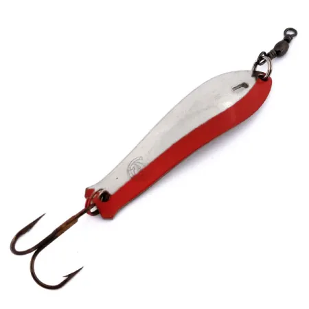 Tämä 6 cm pitkä italialaisvalmisteinen lusikkauistin on klassinen esimerkki Panther Martinin Lampo Pesante da Lancio -sarjasta. Nikkeliviimeisteltyä runkoa korostaa toisessa reunassa oleva kirkkaanpunainen raita, joka luo terävän värikontrastin kiillotettua metallia vasten. 11 g painoisena uistimen paksuus on tarkoitettu pitkiin heittoihin ja syvempien vesikerrosten tavoittamiseen, joissa kevyemmät lusikat saattaisivat uida liian pinnassa. Etupuolella on nähtävissä pieni valmistajan leima, joka vahvistaa sen alkuperän ja merkin historian. Varustukseen kuuluu yläosaan asennettu leikari siiman kiertymisen estämiseksi ja kestävä kolmihaarakoukku, joka on kiinnitetty uistinrenkaalla perään. Tämä yksilö on erinomaisessa 5/5 kunnossa, ja heijastava nikkelipinta sekä maalatut yksityiskohdat näyttävät erittäin hyviltä alkuperäisen pronssiviimeistellyn koukun rinnalla.