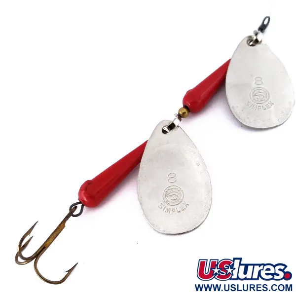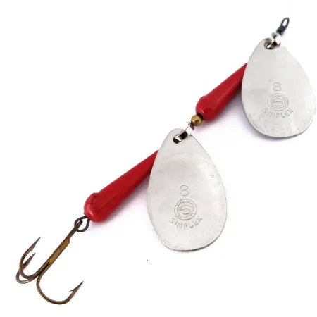 Niklattuihin lehtiin stanssattu klassinen "SIMPLEX"-logo ja numero "8" osoittavat tämän Italiassa valmistetun Panther Martin Simplex Tandem -lipan (tuotekoodi 10546) olevan arvokas vintage-yksilö. Painoltaan 14 g (1/2 oz) ja pituudeltaan täydet 10 cm (4") oleva tandem-lippaviritelmä koostuu kahdesta erillisestä lehdestä, jotka on asennettu yhteen lanka-akseliin. Lehtien ja perässä olevan kolmihaarakoukun välissä on kartiomaisia, kirkkaanpunaisia runko-osia, joita erottavat pienet messinkihelmet. Toisin kuin tavallisessa yksilehtisessä lipassa, tämä kokoonpano moninkertaistaa niklauksen välkkeen vedessä. Tämä kyseinen yksilö on käyttämätön, ja sen alkuperäinen tehdaspinta on säilynyt virheettömänä akselista koukkuun asti. Metalliosat ovat kirkkaat, mikä korostaa näiden vuosisadan puolivälin italialaisten vientituotteiden korkeaa laatua. Jokainen lehti pyörii suoraan akselin ympäri, mikä on mallille tyypillinen piirre ja poistaa erillisen sangan tarpeen. Terävä kolmihaarakoukku on kiinnitetty tukevasti perään, ja se soveltuu erinomaisesti heittämiseen voimakkaassa virrassa tai syvissä suvannoissa.