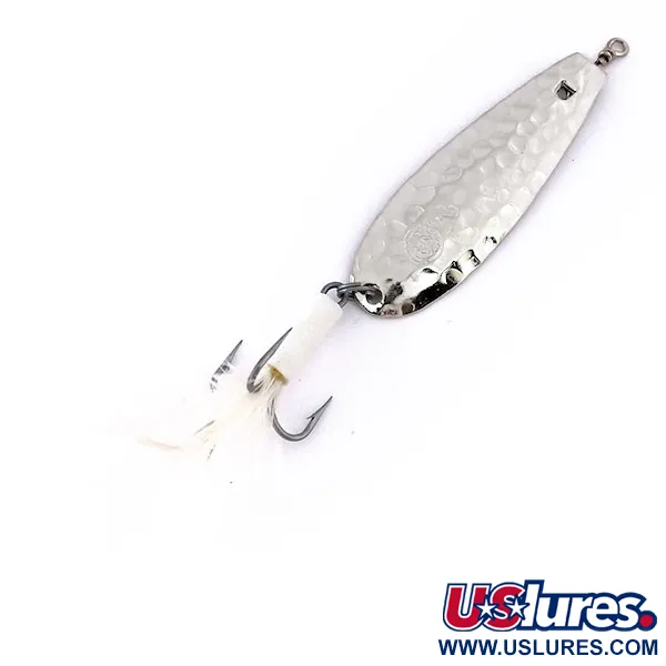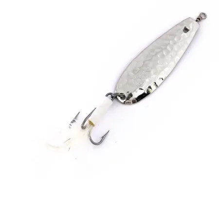 Vasaroitu nikkelipinta luo heijastuksia tähän Italiassa valmistettuun lippaan, mikä on suunniteltu maksimoimaan välke heitossa ja uistelussa. Painoltaan 5,5 g (3/16 oz) ja pituudeltaan 5,5 cm (2 1/4") oleva Panther Martin Svizzero Martellato con penna on käyttämätön. Vieheessä, tuotekoodiltaan 10255, on valkoinen höyhenillä varustettu kolmihaurakoukku, joka antaa sille pehmeän ja luonnollisen hahmon. Italialaista käsialaa olevaan rakenteeseen kuuluu kestävä leikari, joka ehkäisee siiman kiertymistä. Metallin jokainen vasarointijälki on tarkasti lyöty, ja koukun valkoinen sidos on puhdas ja erinomaisessa kunnossa.