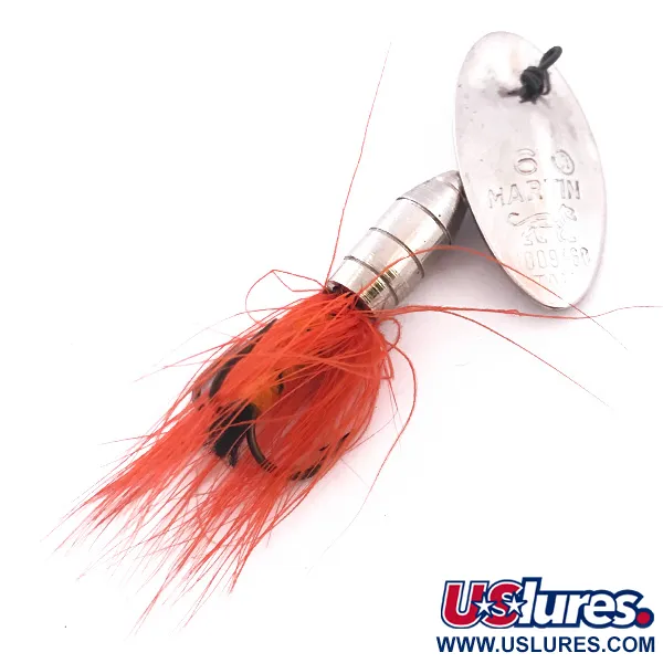 Tässä hopeisessa lipassa on selkeä stanssaus "6.0 MARTIN ITALY", ja se edustaa huolellista italialaista käsityötä, josta merkki on tunnettu. 6 grammaa (3/16 oz) painava ja 5 cm (2 in) pitkä "Zavorra con Mosca" (painotettu perholla) -malli sisältää erottuvan pisaranmuotoisen rungon hopeisella viimeistelyllä. Toisin kuin tavalliset lipat, tämän mallin lippa-osa pyörii suoraan varren ympäri, mikä mahdollistaa välittömän uinnin alkamisen. Tämän 4028-mallin silmiinpistävin piirre on kirkkaanpunainen sulkakoukun sidos, joka antaa vahvan visuaalisen profiilin hopeisen välkkeen alla. Kunnoltaan vieheessä on hyvin pieniä iän merkkejä metallissa, kun taas sulat ovat säilyneet tuuheina ja kirkkaina, mikä oikeuttaa kuntoluokitukseen 4/5.