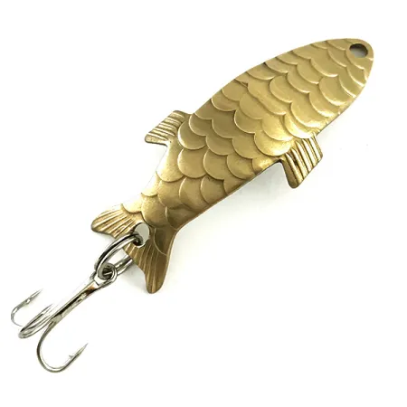 Tämän 7 g (1/4 oz) painoisen messinkirunkoisen lusikkauistimen pintaan on meistetty yksityiskohtainen suomukuvio, ja se on klassinen esimerkki vuosisadan puolivälin amerikkalaisista kalastusvälineistä. Keräilijät tunnistavat tämän mallin Pee Bee -uistimeksi, jota Al's Goldfish valmisti Yhdysvalloissa ja jonka tuotanto päättyi 1970-luvulla. Tuotekoodilla 6185 luetteloitu yksilö on tarkalleen 5 cm (2") pitkä ja siinä on merkille ominainen selkeä kalan siluetti ja eväyksityiskohdat. Kääntöpuolelle on selkeästi pakotettu merkin ja mallin nimet, mikä todistaa sen aitouden harvinaisuutena. Tämä yksilö on 5/5-kunnossa, ja sen metallipinnat ovat puhtaat ja tasaiset. Varustukseen kuuluu tukeva uistinrengas ja terävä kolmihaarakoukku, joka on tarkoitettu kevyeen heittokalastukseen. Jokainen suomu kuperalla puolella on tarkasti erottuva, mikä korostaa vuosikymmeniä sitten käytettyjen alkuperäisten meistien laatua.