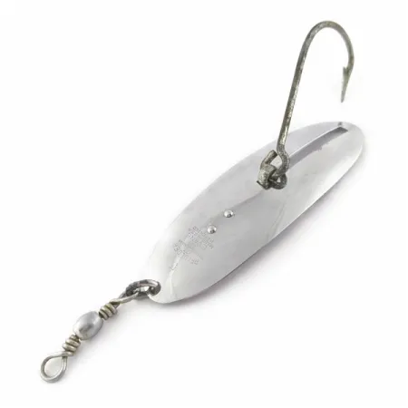Nikkelipinnoite peittää 8,5 cm:n (3 1/4") pituisen Pflueger Evans Record №5 -lusikan, ja sen kaareva pinta kimaltelee kirkkaasti. Tämä Yhdysvalloissa valmistettu lusikkauistin painaa 21 g (3/4 oz), mikä antaa sille tarvittavan painon syvemmälle pääsemiseksi uistelussa tai heittokalastuksessa. Valmistajan leima on lyöty selvästi metalliin osoituksena keräilijöiden suosimasta Evans Record -sarjasta, ja se sijaitsee lähellä kahta näkyvää niittiä lusikan keskellä. Tämän yksilön (tuotekoodi 23990) vakiovarustukseen kuuluu tukeva yksihaarakoukku ja metallilangalla varmistettu perukelenkki pienellä metallihelmellä. Sen kuntoluokitus on 5/5, ja sille on ominaista poikkeuksellisen siisti viimeistely ja erinomaisesti säilynyt rakenne. Paksu metallirakenne on osoitus Pfluegerin kalastustarvikevalmistuksen korkeista teollisuusstandardeista 1900-luvun puolivälissä.