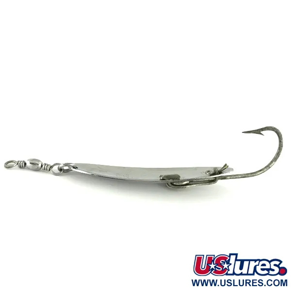 Nikkelöityyn pintaan on selkeästi meistetty merkintä "PFLUEGER RECORD MADE IN AKRON, O. U.S.A. 5", joka ankkuroi tämän lusikkauistimen sen historiallisiin Ohion valmistusjuuriin. Tämä 2/3 oz (20 g) painoinen lusikka on pituudeltaan 3 1/4" (8 cm) ja siinä on säilynyt Pfluegerin puolivälin vuosisadan käsityölle tyypillinen kirkas, heijastava ulkonäkö. Kuntoluokituksella 4/5 metallissa on hienoisia ajan merkkejä, mutta se on säilynyt puhtaana ja hyvin hoidettuna. Rakenteessa on erityinen ruohosuojattu muotoilu, jossa käytetään lankasuojaa suojaamaan suurta yksittäiskoukkua tiheässä kasvustossa kalastettaessa. Tuotekoodilla 7116 tunnistettu malli on suunniteltu monikäyttöiseksi, toimien sekä tavallisena lusikkana että ruohosuojattuna vaihtoehtona kalastajan tarpeiden mukaan. Kärkeen on liitetty kestävä leikari, joka on suunniteltu hallitsemaan siiman kiertymistä kelauksen aikana. Paino ja soikea profiili on tasapainotettu pitkiä heittoja varten kasvillisuuden aukkoihin.