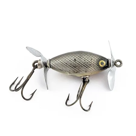 Tämä vain 4 cm (1 1/2 tuumaa) pitkä Phillips Crippled Killer edustaa pienempää ja harvinaisempaa profiilia vintage-pintavieheiden maailmassa. Runkoa koristaa klassinen hopeasuomukuvio (silver scale), jota täydentävät selkeä tumma täplä kyljessä ja poikkeuksellisen kirkkaana säilyneet keltaiset silmät. Nokan ja pyrstön kaksoispotkurit on kiinnitetty tukevilla metalliosilla, ja vieheessä on kaksi pintakalastukseen tarkoitettua kolmihaarakoukkua. Tässä yhdysvaltalaisessa 7 gramman (1/4 oz) yksilössä on alkuperäinen, 1900-luvun puolivälin tuotannolle tyypillinen ruuvisilmukkakenne tuotekoodilla 23434. Maalipinnassa on vain vähäisiä käytön jälkiä koukkukiinnikkeiden lähellä, mikä heijastaa hyvin hoidettua kuntoa 4/5.