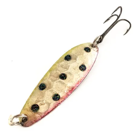 Vasaroitu hunajakennotekstuuri luo moniulotteisia heijastuksia tämän Pirate Lures -lusikan hopeoidulle pinnalle, joka on laadukas USA:ssa valmistettu viehe. 6,5 cm (2 1/2") pitkä ja 12 g (2/5 oz) painava Pirate Joe's Silver Plated on tasapainotettu monipuoliseen kalastukseen. Värityksessä on vaaleanvihreänkellertävä selkä ja vaaleanpunertava vatsa, joita täydentää seitsemän kimaltavaa mustaa pistettä tarjoten selkeät iskupisteet hopeista pohjaa vasten. Taustapuoli korostaa kirkasta hopeointia ja stanssatun suomukuvion syvyyttä. Varustettuna alkuperäisillä uistinrenkailla ja terävällä kolmihaarakoukulla, tämä yksilö (tuotekoodi 12483) on 5/5 kunnossa. Hopeointi on säilyttänyt loistonsa, mikä osoittaa perinteistä Pirate Lures -käsityötä, joka on suunniteltu heitto- ja vetouisteluun.