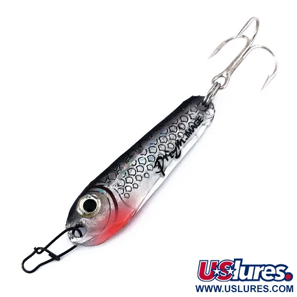 Täsmälleen 5 cm (2") pitkä Wahoon Prizm Image on varustettu umpimetallirungolla, jossa on hopeinen pohjaväri ja hienostunut musta suomukuvio kyljissä. Kurkun kirkkaanpunainen korostus luo jyrkän kontrastin heijastavaan prisma-viimeistelyyn, jota täydentää suuri, realistinen silmä lisäämään ärsykevaikutusta. Tämä tuotekoodilla 10045 tunnistettu yksilö on huippukunnossa (arvosana 5/5), eikä sen kiillotetuissa pinnoissa ole kulumisen jälkiä. Yhdysvalloissa valmistettu viehe painaa 14 g (1/2oz) ja se on varustettu tehtaalla asennetulla lukkoleikarilla sekä terävällä kolmihaarakoukulla, joka on kiinnitetty vahvalla uistinrenkaalla. Kylkeen painettu selkeä "Prizm Image" -merkintä takaa aitouden vintage-metallivieheiden keräilijöille.