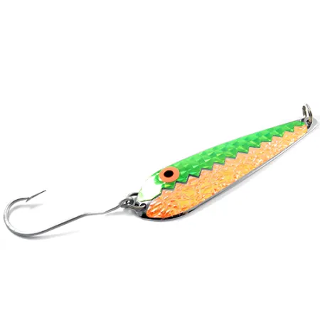 Fluoresoiva vihreä ja teksturoitu oranssi kohtaavat terävässä, sahalaidassa kuviossa tässä Yhdysvalloissa valmistetussa vetolusikassa. Kiillotetulle hopeiselle kääntöpuolelle on selvästi leimattu Pro King -tuotemerkki, mikä osoittaa sen perinteet Suurten järvien kalastuksessa. Runko painaa 12,5 g (2/5 oz) ja se on muotoiltu syrjäyttämään vettä tehokkaasti uistelun aikana. Uistin on 9,5 cm (3 3/4") pitkä, ja se on varustettu suurella yksihaaraloukulla ja ruostumattomilla uistinrenkailla. Tuotekoodilla 1851 tunnistetun uistimen viimeistely on 5/5-kunnossa. Oranssin puoliskon hunajakennomainen tekstuuri antaa voimakkaan kontrastin kiinteälle vihreälle yläosalle, mikä on klassinen väriyhdistelmä näkyvyyteen syvässä vedessä.