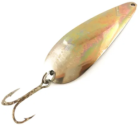 Sateenkaarenhohtoinen pinta peittää tämän vintage-lusikan messinginsävyisen etupuolen, tarjoten näyttävän kontrastin kiillotetulle nikkelitaustalle. Tuotekoodilla 4630 tunnistettu American Sportsman -viehe on pituudeltaan 6,5 cm (2 1/2 tuumaa), ja sen takapuolelle on leimattu suoraan metalliin "PRO-SPOON"-tunnus. 10,5 g (3/8 oz) paino tekee siitä jämäkän valinnan erilaisiin heittokalastustekniikoihin, ja 5/5 kuntoluokitus korostaa sen hyvin säilynyttä viimeistelyä ja osia. Päädyssä hienovaraiset kaiverretut chevron-viivat johtavat siimasilmukkaan, ja alaosaan on kiinnitetty tukevan uistinrenkaan avulla vakiomallinen kolmihaarainen koukku. Tämä Yhdysvalloissa valmistettu viehe on esimerkki yksinkertaisista ja tehokkaista malleista, joita vuosisadan puolivälin kalastajat suosivat eri syvyyksissä ja valo-olosuhteissa.