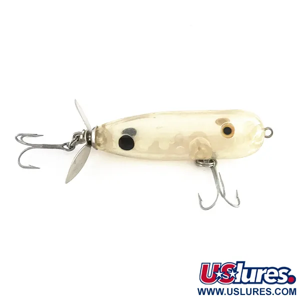 Tämän klassisen pintauistimen takaosassa on yksi hopeanvärinen potkuri, joka on suunniteltu rikkomaan pintakalvoa tasaisella kelauksella. Painoltaan 9,5 g (1/3 oz) ja pituudeltaan 6,5 cm (2 1/2") oleva malli on varustettu täysin läpinäkyvällä muovirungolla, joka paljastaa sen äänekkäästä profiilista vastaavat rätinäkuulat. Tuotekoodilla 7917 tunnistettava viehe on amerikkalaisen The Producers -yhtiön erottuva luomus. Sen ulkonäköä korostavat suuret, korkeakontrastiset maalatut silmät, jotka tarjoavat selkeän kohteen pintaiskuja tekeville pedoille kuten bassille ja hauelle. Varustukseen kuuluu kaksi kolmihaarakoukkua – yksi vatsassa ja yksi potkurin takana – kiinnitettynä pyöristettyyn, sikarinmuotoiseen runkoon. Tämä hyvin pidetty yksilö on käyttämätön, ja sen kuntoluokitus on 5/5.