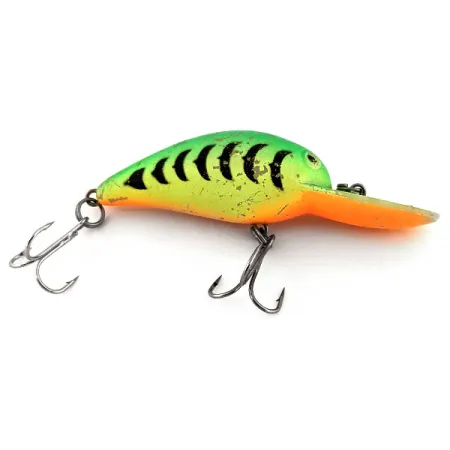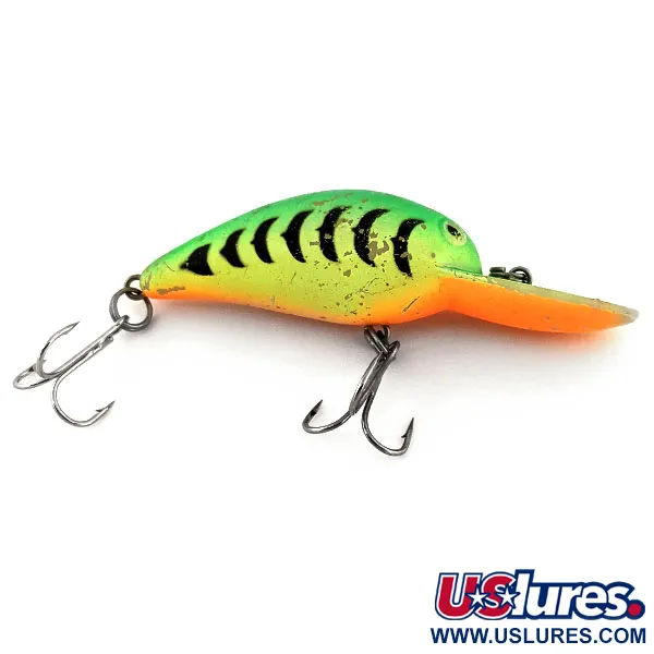 Tämä eloisalla Fire Tiger -värityksellä varustettu vintage-amerikkalainen vaappu on suunniteltu sekä heittokalastukseen että uisteluun. Producers B52 UV painaa 1/3 oz (10 g) ja on pituudeltaan 2 1/4" (5,5 cm). Se on suunnattu kuhalle ja hauelle 1,8–2,4 metrin (6–8 ft) uintisyvyyteen. Tässä räminäkuulilla varustetussa kelluvassa mallissa on tuotekoodi 13175, ja se on erityisen tunnettu UV-ominaisuuksistaan. Ultraviolettivalossa viimeistely hohtaa kirkkaasti, mikä on suunniteltu parantamaan näkyvyyttä syvässä tai sameassa vedessä. Varustukseen kuuluu kaksi terävää kolmihaarakoukkua, ja rungossa on vähäistä, aitoa kulumaa (kuntoluokitus 4/5). Kirkkaan oranssi kurkku ja uintilevy luovat vahvan kontrastin mustaraitaiselle vihreälle selälle.