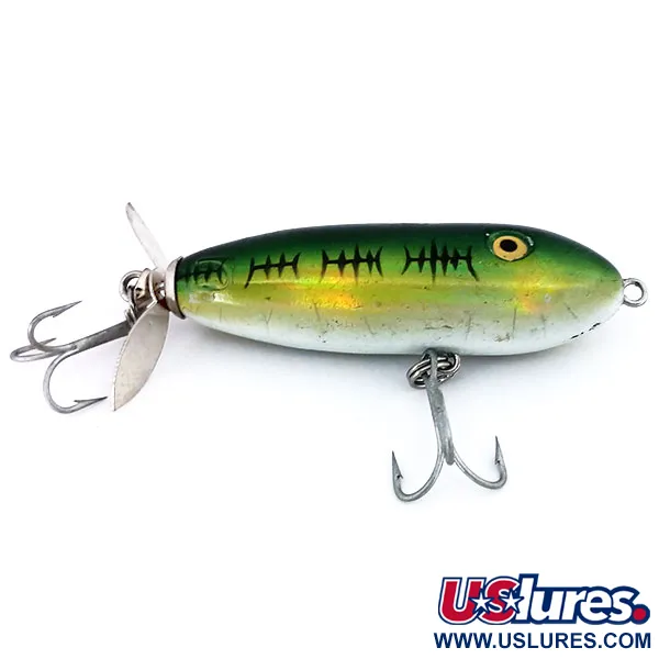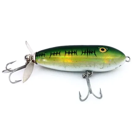 Klassisten amerikkalaisten vieheiden Rainbow Green -viimeistelyissä on usein näyttävä siirtymä syvistä metsän sävyistä hohtavaan kultaan, ja tämä Producers Turbo on siitä loistava esimerkki. Pituudeltaan 6 cm (2 1/4") ja painoltaan monikäyttöinen 9 g (1/3 oz), tämä pintaviehe on varustettu erottuvalla mustalla luukuviolla, joka on kerrostettu sen sateenkaarivärisiin kylkiin. Kelluva, torpedonmuotoinen runko on varustettu perään asennetulla hopeisella potkurilla. Potkuri on kiinnitetty tukevalla ruuvilenkillä, joka ankkuroi myös peräkoukun, kun taas toinen kolmihaarakoukku sijaitsee mahan alla varmistamassa hauen ja ahvenen tartutuksen. Tuotekoodilla 10597 varustettu uistin on erinomaisessa kunnossa (arvosana 4/5), ja siinä on vain vähäisiä käytön jälkiä. Suuret, keltaiseksi maalatut silmät tarjoavat kontrastikkaan kiintopisteen tummanvihreää päätä vasten. Kelluvana pintavieheenä sen varustus on suunniteltu pinta-ajoon, jossa takalevy aiheuttaa paikallista häiriötä tasaisen kelauksen aikana.