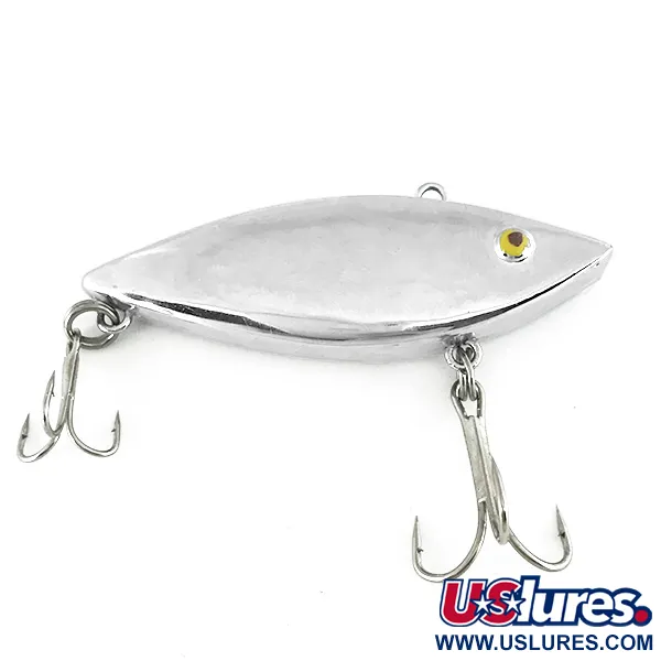 Peilipinnat, kuten tässä 6,5 cm (2 1/2") rungossa, on suunniteltu heijastamaan mahdollisimman paljon välkettä jopa sameassa vedessä. Tämä Producers Zero Tyrone Boomer Wells, tuotekoodi 7187, on uppoava ja rämisevä viehe, joka on suunniteltu erityisesti ahvenen ja kuhan kalastukseen. Sen 8,5 g (1/3 oz) paino ja kompaktin yhdysvaltalainen profiili mahdollistavat tarkat heitot ja syvempien vesikerrosten saavuttamisen. Viehe on varustettu kahdella uistinrenkailla kiinnitetyllä kolmihaarakoukulla, ja yläpuolinen siiman kiinnityspiste viittaa lipless-malliin, joka on tarkoitettu uppoavaan uintiin. Erittäin heijastava Mirror-pinta on viimeistelty klassisella keltaisella silmällä ja tummalla pupillilla näkyvyyden varmistamiseksi. Tämä yksilö on 5/5 kunnossa ja käyttämätön; kromimainen ulkopinta ja koukut ovat täysin kulumattomat.