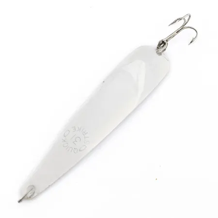 Lavan alaosaan selkeästi meistetty 'QUICK STRIKE 31' -merkintä tunnistaa tämän klassisen amerikkalaisvalmisteisen lusikkauistimen. Pituudeltaan 9,5 cm (3 3/4") ja painoltaan 4,5 g (3/16 oz) oleva viehe on varustettu kapealla, suippenevalla rungolla, jossa on korkeakiiltoinen hopeaviimeistely. Tämä yksilö on erinomaisessa kunnossa; heijastava pinta on kirkas ja kaikki osat ovat täysin ehjiä, mikä oikeuttaa kuntoluokitukseen 5/5. Yksi kolmihaarakoukku on kiinnitetty uistinrenkaalla leveämpään takaosaan, kun taas kapeassa kärjessä on siisti siiman kiinnitysreikä. Tuotekoodilla 22320 luetteloitu viehe on harvinaisuus, jonka yksinkertainen mutta tehokas metallirakenne on suunniteltu heitto- tai vetouisteluun.