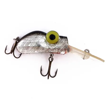 Hopeinen ristikuviointi määrittää tämän yhdysvaltalaisen uistimen 4,5 cm (1 3/4") profiilin. Rabble Rouser Roo-Tur painaa 9 g (1/3 oz) ja on varustettu leveällä kirkkaalla muovisella uintilevyllä, joka on suunniteltu syvälle sukeltaviin esitystapoihin. Punainen väri uintilevyn juuressa tuo hienovaraisen kontrastin kirkkaalle metallirungolle. Kaksi pronssattua kolmihaarakoukkua on kiinnitetty vatsaan ja perään, ja suuret keltaiset silmät mustilla pupilleilla antavat vieheelle sen ikonisen ilmeen. Tuotekoodilla 10278 luetteloitu uistin on 5/5-kunnossa, eikä sen heijastavilla pinnoilla ole käytön jälkiä. Sivujen ristikkomainen tekstuuri jäljittelee monimutkaista suomukuviota ja korostaa Rabble Rouserin USA:n tuotannon omaleimaista valmistustyyliä.