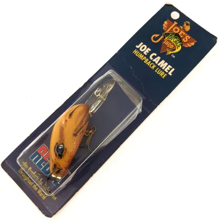 Tässä omaleimaisella camel-viimeistelyllä varustetussa mainosvieheessä on ikoninen Joe Camel -maskotti suoraan sen 5 cm:n (2") rungossa. Rebelin Joe's Tackle Shopille valmistama Humpback Humpy (tuotekoodi 12894) painaa 10 g (1/3 oz) ja edustaa ainutlaatuista yhdistelmää tupakkamuistoesineitä ja vintage-kalastusvälineitä. Tämä yksilö on käyttämätön alkuperäisessä läpipainopakkauksessaan, ja sen kuntoluokitus on 6. Vaapussa on sisäinen räminäkammio ja suuri kirkas uintilevy, joka on suunniteltu syvälle sukeltamiseen. Pakkauskortin kääntöpuolella korostetaan valmistajan ja savukemerkin välistä yhteistyötä ja mainitaan erikseen vieheen alkuperä Rebeliltä. Varustukseen kuuluu kaksi terävää, pronssattua kolmihaarakoukkua, jotka on kiinnitetty ruostumattomilla uistinrenkailla.