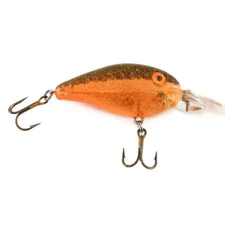 Kullan- ja kuparinsävyiset kimalteet on pakattu tiheästi tämän Rebel Crank R -vaapun yläosaan, mikä luo upean kontrastin sen 5 cm (2") läpinäkyvään runkoon. Tuotekoodilla 11272 merkitty 9,45 g (1/3 oz) viehe on vakiovaruste niille, jotka arvostavat perinteisten USA:ssa valmistettujen kalastusvälineiden kestävyyttä. Läpinäkyvässä uintilevyssä on Rebel-logo, ja se ohjaa vaapun 0,9–1,6 metrin (3–5 ft) syvyyteen kelauksen aikana. Kelluva runko on ihanteellinen kalastukseen uponneiden esteiden ympärillä, missä 'Transparent with Red Glitter' -viimeistely välähtelee tehokkaasti. Tämä yksilö on erinomaisessa 5/5-kunnossa, eikä koukuissa tai pinnoitteessa ole käytön jälkiä. Suuret oranssit silmät tummilla pupilleilla ovat klassinen kiintopiste päässä, mikä on tyypillistä Rebelin korkealaatuiselle Crank R -sarjalle.