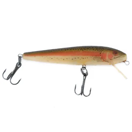 Tämä Yhdysvalloissa valmistettu 4 g (1/8 oz) painava minnow-vaappu edustaa sitä yksityiskohtaista viimeistelyä, josta Rebel tuli tunnetuksi alkuvuosinaan. Tuotekoodilla 11085 varustetussa vieheessä on realistinen Rainbow Trout -kuviointi läpikuultavalla Ghost-pohjalla. Pituudeltaan 7 cm (2 3/4") muovirunko on varustettu kahdella terävällä kolmihaarakoukulla, jotka on kiinnitetty kestävillä uistinrenkailla. Integroitu kirkas uintilevy on suunniteltu saavuttamaan 0,9–1,8 metrin (3–6 ft) syvyys, mikä tekee siitä monipuolisen valinnan sekä heittokalastukseen että uisteluun. Tämä yksilö on 5/5-kunnossa, ja sen metalliosat sekä kylkien hienot täplät ovat säilyneet erinomaisesti. Kalastajat onnistuvat tällä kelluvalla vaapulla yleensä tasaisella kelauksella tai perinteisellä stop-and-go-uitolla.
