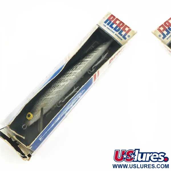 Tämän F12 Floaterin kaltaiset hopeasuomupinnat määrittelevät amerikkalaisten kalastusvälineiden muovikauden puoliväliä. Viehe painaa 9 g (1/3 oz) ja on pituudeltaan 12 cm (4 3/4"). Tämä yksilö on käyttämätön ja säilynyt alkuperäisessä ikkunallisessa pakkauksessaan. Yhdysvaltalaiset Rebel-uistimet olivat edelläkävijöitä korkealaatuisten muovien hyödyntämisessä tasaisen kelluvuuden ja kestävyyden saavuttamiseksi. Tämä malli (tuotekoodi 23929) on suunniteltu 1,2–1,8 metrin uintisyvyyteen sekä heitto- että uistelukalastuksessa. Heijastavaa hopeista runkoa täydentää kolme vankkaa kolmihaarakoukkua, mikä osoittaa Rebelin käyttävän kestäviä varusteita suuremmissa minnow-malleissaan. Pakkauksessa on varhainen logo, joka on viittaus yrityksen historialliseen pakkaustyyliin. Suuret, keltareunaiset silmät toimivat katseenvangitsijana teksturoitua kylkikuviota vasten. Kirkas muovinen uintilevy on kiinnitetty tukevasti nokkaan, mikä varmistaa, että uistin pysyy 1,2–1,8 metrin syvyysalueella tasaisessa kelauksessa tai katkonaisessa uitossa.
