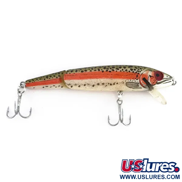 Eloisa taimenkuviointi tummilla pilkuilla ja rohkealla oranssinpunaisella kylkiviivalla määrittelee tämän 9 cm (3 1/2") muovisen vaapun ulkonäön. Tuotekoodilla 8016 varustettu Rebel Floater Jointed painaa 7 g (1/4 oz) ja edustaa klassista amerikkalaista uistinhistoriaa USA:sta. Kaksiosainen runko on yhdistetty kestävällä mekaanisella nivelellä, joka on suunniteltu tarjoamaan erityinen uintiliike heitto- tai uistelukäytössä. Tämä yksilö on säilynyt 5/5-kunnossa; sen pinta on puhdas ja kolmihaarakoukut ovat kirkkaat ja ruosteettomat. Tasaisella kelauksella tai stop-and-go-rytmillä se saavuttaa 1,2–1,8 metrin (4–6 ft) syvyyden. Etuosaan on integroitu kirkas, kulmikas uintilevy helpottamaan sukeltamista vesipatsaassa.