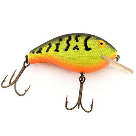 Fire Tiger -kuviointi korkeakontrastisilla neonkeltaisilla ja oransseilla siirtymillään tekee tästä 6,5 cm (2 1/2") vaapusta erittäin näkyvän. Tuotekoodilla 12868 tunnistettavassa Rebel Mini R -mallissa on teksturoitu runko, joka heijastaa valoa tumman oliivinvärisen selän ja selkeiden mustien pystyraitojen alla. Kirkas, neliönmuotoinen uintilevy on leimattu klassisella Rebel-logolla, ja se on suunniteltu saavuttamaan 0,4–1,2 metrin (1,3–3,9 ft) uintisyvyys. Tämä 17 g (3/5 oz) painava yksilö on keräilyharvinaisuus 5/5-kunnossa, ja siinä on säilynyt eloisa alkuperäinen viimeistely ja koukut. Käytettiinpä sitä heittokalastuksessa tai uistelussa, viehe käyttäytyy vedessä suspendina (pysähtyvänä). Vatsa muuttuu syvän oranssiksi kurkun lähellä, ja keltaiset silmät mustilla pupilleilla tarjoavat tarkan iskupisteen. Molemmat kolmihaarakoukut ovat erinomaisessa kunnossa, eikä kärkissä ole merkkejä käytöstä tai kulumisesta.
