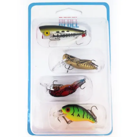 Neljä erilaista ultrakevyttä profiilia alkuperäisessä käyttämättömässä kunnossa muodostavat tämän Rebel Ultralight Kit -sarjan, tuotekoodi 10944. Tämä kokoelma on alkuperäisessä läpipainopakkauksessaan, mikä säilyttää vieheiden tehdasuuden kunnon. Mukana on ikoninen Pop-R 2" (5 cm), joka on suunniteltu pintakalastukseen. Crickhopper on kooltaan 1 1/2" (4 cm) ja se tavoittaa 0,5–0,9 metrin syvyydet. Syvemmälle mentäessä Teeny Wee-Crawfish — myös 1 1/2" (4 cm) — saavuttaa 0,5–1,5 metrin syvyyden realistisella rapukuvioinnillaan. Sarjan täydentää Teeny R kirkkaassa Fire Tiger -värityksessä; se on 1 1/2" (4 cm) suspender-viehe, joka toimii 0,4–1,2 metrin syvyydessä. Jokainen malli edustaa valmistajan perinteitä tehokkuudessa eri lajeille, kuten bassille, ahvenkaloille ja taimenelle. Pakkauksen kääntöpuoli korostaa soveltuvuutta pienille puroille ja suurille järville. Varustukseen kuuluu pienet, terävät kolmihaarakoukut, jotka sopivat ohuille siimoille.