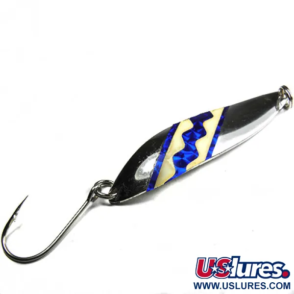 Kiillotettuun nikkelitaustaan selkeästi leimattu ”RED EYE LURES” -brändäys vahvistaa tämän amerikkalaisvalmisteisen lusikan alkuperän. Painoltaan 1/2 unssia (14 g) ja pituudeltaan 3 tuumaa (7,5 cm) olevassa metallirungossa on erottuva sinivalkoinen siksak-kuviointi, joka luo voimakkaan kontrastin heijastavaa nikkelipintaa vasten. Tämä nimenomainen yksilö, tuotekoodilla 0287, on varustettu vankalla yksihaarakoukulla, joka on kiinnitetty tukevalla uistinrenkaalla. Se on luotettava valinta heittokalastukseen rakenteiden luona tai syvän veden uisteluun. Eppingerin valmistuslaatu näkyy metallin paksuudessa, mikä antaa sille kokoonsa nähden merkittävästi painoa. Tämän vieheen kunto on vahva 4/5, pinnat ovat erittäin hyvin säilyneet ja kuviot ehjät.