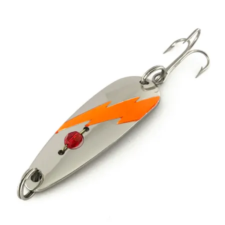 Nikkelipinnoite luo voimakkaasti heijastavan taustan tämän Red Eye Lures Evil Eye UV -uistimen kirkkaan oranssille salama-kuviolle. Tuotekoodilla 7556 tunnistettava lusikkauistin painaa 1/2 oz (14 g) ja sen pituus on 2 1/4" (5,7 cm). Tämän Yhdysvalloissa valmistetun mallin tunnusmerkki on särmikäs punainen helmi, joka on kiinnitetty lusikan runkoon siimalenkin läheisyyteen; se taittaa valoa eri tavalla kuin kiillotettu metalli. UV-valossa oranssi fluoresoiva salama reagoi kirkkaalla hehkulla, mikä parantaa näkyvyyttä syvissä tai tummissa vesissä. Uistin on varustettu tavallisella kolmihaarakoukulla ja uistinrenkailla. Tämä kyseinen yksilö on käyttämätön, ja siinä on alkuperäinen tehdaspinta ilman kulumisen merkkejä.