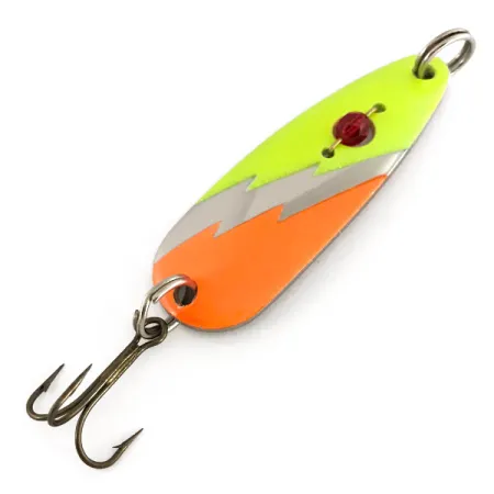 Painoltaan 1/2 oz (14 g) olevan heittolusikan kolmivärinen viimeistely on jaettu erottuvalla siksak-salamakuviolla. Tämä Red Eye Lures Red Eye Evil Eye UV -malli, tuotekoodi 7648, yhdistää kiillotetun nikkelipohjan kirkkaan oransseihin ja chartreuse-segmentteihin. Tämän Yhdysvalloissa valmistetun lusikan keskeinen ominaisuus on rungon yläosaan asennettu hiottu punainen lasihelmi, joka toimii näkyvänä iskupisteenä. Ultraviolettivalossa fluoresoivat väriosiot hohtavat voimakkaasti, mikä parantaa näkyvyyttä merkittävästi syvässä vedessä tai pilvisellä säällä kalastettaessa. Pituudeltaan 2 1/4" (5,7 cm) uistin on varustettu alkuperäisillä osilla, kuten kestävillä uistinrenkailla ja terävällä kolmihaarakoukulla. Tämä yksilö on käyttämätön ja erinomaisessa kunnossa.