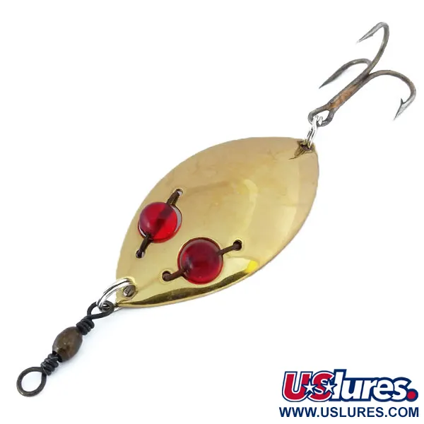 Tämän lusikkauistimen meistetty runko kimaltelee klassisessa kultaviimeistelyssä ja kantaa ylpeänä Rochesterin (NY) perintöään sekä alkuperäistä patenttinumeroaan. Painoltaan 1/2 oz (13 g) ja pituudeltaan 2 1/4" (5,5 cm) oleva Hofschneider Red Eye junior on keräilijöiden suosikki, jotka arvostavat vuosisadan puolivälin amerikkalaista käsityötaitoa. Kaksi näyttävää punaista lasihelmeä on kiinnitetty tukevasti uistimen etupintaan heijastamaan valoa tasaisen kelauksen aikana. Tässä nimenomaisessa yksilössä on tuotekoodi 10929, ja se on 5/5-kunnossa, pinta on kirkas ja metalliosat hyvässä säilytyksessä. Kääntöpuolella on "RED EYE WIGGLER JR." -leima ja Hofschneider Corp. -brändäys. Tukeva kolmihaarakoukku on kiinnitetty vahvalla uistinrenkaalla, ja kärjessä on leikari siiman sotkeutumisen estämiseksi. Tämä lusikka on optimoitu hauen ja ahvenen kalastukseen, erityisesti kun lämpimissä vesissä tarvitaan hitaampaa uintia.