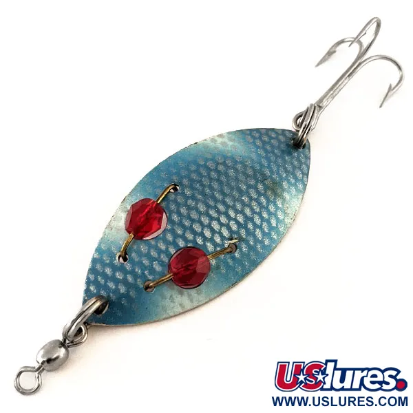 Hiotut punaiset lasihelmet on kiinnitetty tukevasti lusikan runkoon, ja ne toimivat ikonisina iskupisteinä, joista Hofschneider Red Eye Junior on saanut nimensä. Tämä 5,5 cm (2 1/4") pituinen ja 11 g (2/5 oz) painoinen viehe, tuotekoodilla 11330, on varustettu eloisalla sinisellä suomukuviolla hopeisella pohjalla. Lusikan kääntöpuoli on kiillotettua nikkeliä, johon on selvästi leimattu Rochester, NY -valmistajan merkki. Kalastajat luottavat usein tähän klassiseen muotoon hitaassa kelauksessa, mikä tekee siitä vakiovarusteen hauen ja ahvenen kalastukseen lämpimissä vesissä. Varustukseen kuuluu tukeva kärkileikari ja kirkas kolmihaarakoukku pyrstössä. Vieheen kunto on 5/5, ja se on säilyttänyt alkuperäisen kiiltonsa sekä maalatulla suomupuolella että metallisella alapuolella.