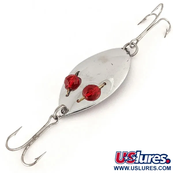 Suuret, valoa heijastavat punaiset silmät määrittelevät tämän nikkelipintaisen lusikkauistimen ulkonäön, jonka tuotekoodi on 12440. Painoltaan 13 g (1/2 oz) ja pituudeltaan 5,5 cm (2 1/4") oleva Hofschneider Corp. -yhtiön Red Eye junior on amerikkalaisen vintage-kalastusvälineistön peruspilari. Yhdysvalloissa valmistettu runko on suunniteltu hitaaseen kelausnopeuteen, jolloin hauki ja ahven voivat keskittyä metallin välkkeeseen kesähelteillä. Kaksi terävää kolmihaarakoukkua on asennettu uistimen molempiin päihin, tarjoten useita tarttumapisteitä uteliaille pedoille. Tämä yksilö on kuntoluokitukseltaan 5/5, ja siinä on hyvin säilynyt kiillotettu pinta sekä tukevasti kiinnitetyt fasetoidut punaiset helmet. Valmistajan leima koveralla puolella on edelleen terävä ja luettavissa, mikä vahvistaa sen olevan aito pala vuosisadan puolivälin kalastushistoriaa.