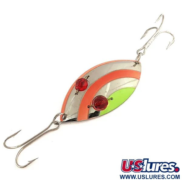 Nikkelöinti toimii pohjana eloisille oransseille ja limenvihreille raidoille tässä 1oz (25g) Eppinger-lusikassa. Pituudeltaan 3" (7,5cm) oleva Red Eye Wiggler on välittömästi tunnistettavissa kahdesta viistehiotusta punaisesta lasihelmestä, joista malli on saanut nimensä. Nämä silmät on kiinnitetty läpivedetyllä langalla metallirunkoon, jolloin ne vangitsevat ja heijastavat valoa hitaan kelauksen aikana, jota käytetään usein hauen tai ahvenen kalastukseen lämpimissä vesissä. Vieheen taakse on leimattu Eppinger-merkki, siinä on tuotekoodi 11755 ja klassinen lusikkaprofiili, joka on suunniteltu pitkiin heittoihin. Kokoonpanoon kuuluu kolmihaarakoukku sekä vieheen etu- että takaosassa. Tämä yksilö on 5/5-kunnossa, ja siinä on loistava viimeistely sekä täysin ehjät värikuviot nikkelipinnalla.