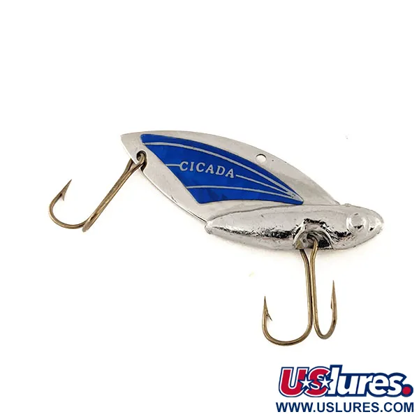 Nikkeliviimeistellyt pinnat ja syvänsininen kontrasti kohtaavat tässä 11470-mallissa, korostaen metallisiivessä olevaa 'CICADA'-leimaa. Painoltaan 11 g (2/5 oz) ja pituudeltaan 5 cm (2") värinäviehe on suunniteltu vertikaalijigaukseen tai heittokalastukseen. Varustukseen kuuluu kaksi pronssinväristä kaksoiskoukkua, yksi alla ja yksi takana, minimoiden pohjatärpit. Tämä amerikkalaisvalmisteinen yksilö on luokiteltu 5/5, siinä on selkeä logo ja hyvin säilynyt maali sinisissä kohdissa. Lyijyrunko on valettu tukevasti terän tyveen, tarjoten pohjaläheisissä tekniikoissa tarvittavan tiheyden.
