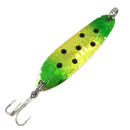 Tämän 9g (1/3oz) Renegade-lusikan pakotetut metallipinnat luovat tekstuurisen taustan näyttävälle vihreä-keltaiselle liukuvärjäykselle. Kuusi selkeää mustaa pistettä on leimattu 5,5cm (2 1/4") rungon keskiviivaa pitkin, mikä lisää korkean kontrastin visuaalisen elementin viimeistelyyn. Vieheen kääntäminen paljastaa kiillotettuun hopeiseen taustaan painetun "RENEGADE"-tuotenimen, mikä vahvistaa sen alkuperän USA:ssa valmistetuna kalastusvälineenä. Tämä kyseinen tuote, tuotekoodilla 7898, on poikkeuksellisen siisti ja saa 5/5 kuntoluokituksen kirkkaiden heijastustensa ja ehjän värityksensä ansiosta. Varustukseen kuuluu kaksi kestävyydeltään raskasta uistinrengasta ja yksi hopeinen kolmihaarakoukku pyrstössä. Tämä pisaranmuotoinen viehe on suunniteltu monipuoliseen käyttöön heitto- tai uistelutekniikoissa.