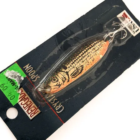 Mustan, kullan ja oranssin sävyt sekoittuvat tämän Renegade Crystalina Spoon -lusikan ainutlaatuiseen kennokuvioon, joka on luetteloitu tuotekoodilla 11830. Tässä 5,5 cm (2 1/4") pituisessa uistimessa on erottuva suomukuvio, joka on painettu kimaltelevan kultaisen pohjan päälle, yhdistettynä kirkkaan oranssiin vatsaan ja tummanmustaan selkään. Tämä yksilö on käyttämätön ja edelleen alkuperäisessä Honeycomb Series -myyntipakkauksessaan. Painoltaan 11 g (2/5 oz) oleva lusikka kantaa pakkauksessa "Made in USA" -merkintää, mikä korostaa sen kotimaista valmistushistoriaa. Pakkauksen kääntöpuolella kuvataan "Crystalina"-viimeistelyn erityinen muotoilu, joka on kehitetty tuottamaan erikoistunut valonheijastuskuvio. Kaikki alkuperäiset osat, mukaan lukien kolmihaarakoukku ja uistinrenkaat, ovat tehdasuudessa kunnossa.