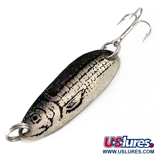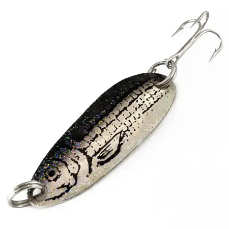 Pituudeltaan 4 cm (1 1/2") oleva Renegade Crystalina Spoon - Honeycomb Series erottuu edukseen Minnow-viimeistelyllään, jossa kimalteleva musta selkä yhdistyy hopeanväriseen pohjaan, jossa on painetut kalanpää- ja suomuyksityiskohdat. Tämä 7 g (1/4 oz) painoinen lusikka tunnetaan tuotekoodilla 11188, ja se on varustettu kestävillä uistinrenkailla ja terävällä kolmihaarakoukulla. Lusikan kääntöpuoli on viimeistelty kirkkaalla, kiillotetulla hopealla, mikä antaa upean kontrastin kuviolliselle puolelle. Tuotteen kunto on 5/5, sillä viimeistely ja koukut ovat täydellisessä kunnossa.