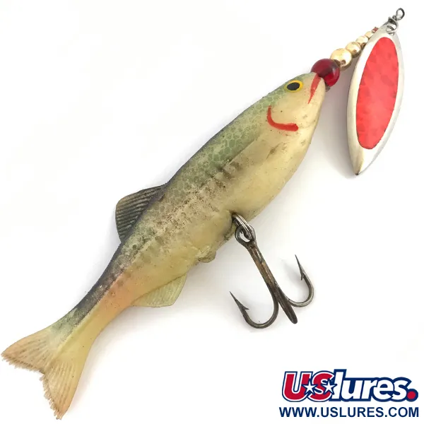 Vihreän ja punaisen sävyt määrittelevät tämän Renosky Lures -malliston 40g (1 1/3 oz) yksilön ulkonäön, tuotekoodilla 4520. Kokonaispituudeltaan 17 cm (6 3/4") viehe on valmistettu pehmeästä, todenmukaisesta rungosta, jossa on luonnollinen siirtymä oliivinvihreästä selästä vaaleaan, kermansävyiseen vatsaan. Päässä on pajunlehti-lippa, jossa on näyttävä punainen insertti, ja se on asennettu kultaisten helmien ja yhden punaisen huomiopallon rinnalle. Vatsassa on tukeva, hyvin säilynyt kolmihaarakoukku, joka on kiinnitetty sisäiseen lankarunkoon. Keräilijät arvostavat käsinmaalattuja yksityiskohtia, kuten keltamustaa silmää ja kirkkaanpunaista kidusviivaa. Rungossa on hienovaraisia pystykuvioita ja teksturoituja eväyksityiskohtia, ja sen laatu on erittäin korkea, vastaten 5/5-kuntoarviota. Alun perin USA:sta peräisin oleva käsityö tässä Renosky-mallissa korostaa merkin kykyä yhdistää kimaltelevat metalliosat teksturoituun pehmovieheprofiiliin.