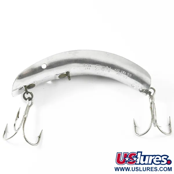 Hopeoidun metallin pintaan selkeästi meistetty merkintä "U.S. PAT OFF No 3" tunnistaa tämän 9 g (1/3 oz) painoisen vieheen teksasilaisen Russelure-yhtiön klassikoksi vuosisadan puolivälistä. Tämä vuonna 1949 valmistettu 8 cm (3 1/4") pitkä malli heijastaa varhaista sodanjälkeistä kalastusvälinesuunnittelua, jossa kestävyys oli ensisijaisen tärkeää. Puolikuun muotoisessa rungossa on kaksi vahvaa kolmihaarakoukkua, jotka on kiinnitetty vatsapuolelle messinginsävyisillä osilla. Tuotekoodilla 3330 luetteloitu hopeapinta on säilynyt kirkkaana ja puhtaana koko kaarevalla pinnalla. Tämä yksilö on erittäin hyvin pidetty ja se on säilyttänyt alkuperäisen kuntonsa arvosanalla 5/5. Siiman kiinnityspiste ja koukkujen kiinnikkeet on integroitu tukevasti metallirunkoon, mikä osoittaa Russeluren tunnettua vankkaa rakenteellista laatua yhtiön perustamisvuodesta 1947 lähtien.