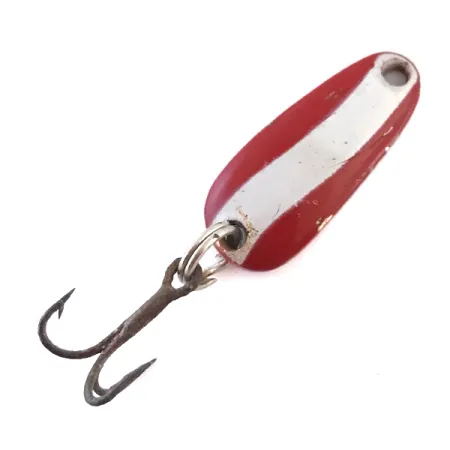 Vinot punavalkoiset emaliraidat koristavat tämän 2,5 cm (1") nikkelisen Salome-lusikan kuperaa puolta. Kyseessä on Acme-kuvastosta poistunut malli. Tuotekoodilla 5437 tunnettu yhdysvaltalaisvalmisteinen viehe on perinteisen pisaranmuotoinen ja suunniteltu makean veden heittokalastukseen. Nikkelöityyn kääntöpuoleen on meistetty valmistajan ja mallin nimi, vaikka teksti onkin hieman kulunut, mikä vaikuttaa kuntoarvioon 4/5. Viehe painaa 3,4g (1/8oz), ja se on varustettu tukevalla uistinrenkaalla sekä vintage-kolmihaaralla, joka on vuosien saatossa saanut tumman, heijastamattoman pinnan. Nikkelipinnan pienet jäljet ovat tyypillisiä vieheen ikään ja käyttöön nähden.