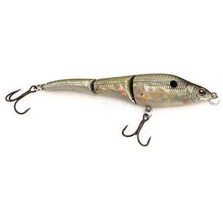 Tämä 9,5 cm (3 3/4") pituinen nivelvaappu on varustettu kolmi-osaisella rungolla, joka antaa sille tunnusomaisen profiilin. Tämän Sebile Magic Swimmer Sinking 95 -vieheen viimeistely jäljittelee luonnollista syöttikalaa: tumman oliivinvihreä selkä vaihtuu kylkien hopeisiin ja kultaisiin holografisiin suomuihin. Pään takana on selkeä musta täplä, joka imitoi shadia. Viehe painaa 10,5 g (3/8 oz) ja se on varustettu kahdella tummalla kolmihaarakoukulla – toinen vatsassa etusegmentissä ja toinen pyrstössä. Tuotekoodilla 13018 varustettu uppoava malli mahdollistaa eri syvyyksien kalastamisen kelausnopeudesta ja uppoamisajasta riippuen. Kyseessä on rämisevä viehe, joka on suunniteltu sekä heittokalastukseen että uisteluun. Yhdysvalloissa valmistettu yksilö on 5/5-kunnossa, eikä saranoissa tai heijastavassa pinnassa ole kulumisen jälkiä. Se soveltuu erinomaisesti toutaimen, lohen, ahvenen tai hauen kalastukseen.