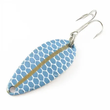 Nikkelöity tausta luo voimakkaasti välkehtivän pohjan tälle varhaisen tuotantokauden lusikkauistimelle. Tämä 5 gramman painoinen ja 3 cm pituinen yksilö on varustettu erottuvalla sinisellä hunajakenno-kuviolla, jonka halkaisee näyttävä kultainen pystyraita. Tuotekoodilla 24346 tunnistettava uistin on alkuperäistä Senecan tuotantoa ajalta ennen kuin Acme Tackle Company osti tuotemerkin 1980-luvun alussa. Seneca-aikakauden Little Cleon löytäminen tässä kunnossa on harvinaista herkkua niille, jotka seuraavat tämän ikonisen kyhmyoselkaisen muotoilun kehitystä. Uistin on käyttämätön ja siinä on tallella alkuperäinen tehtaan viimeistely. Se on varustettu puhtaalla kolmihaarakoukulla, joka on kiinnitetty tukevalla uistinrenkaalla perään; kärjessä on valmis reikä viehelukkoa tai suoraa solmua varten. Yhdysvalloissa valmistetun uistimen työnjälki heijastaa laatua, joka teki Little Cleosta luottovälineen kalastuspakkeihin vuosikymmeniksi.