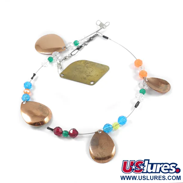 Neljä kuparinväristä kyynellippaa on sijoitettu strategisesti tämän USA:ssa valmistetun klassisen uisteluhoukuttimen runkoon. SEP'S-valmistama (tuotekoodi 2399) houkutin on 50 cm pitkä ja siinä on sarja viistehiottuja helmiä smaragdinvihreänä, taivaansinisenä, meripihkan värisenä ja kirkkaana. Keskellä oleva messinkinen peräsinlevy logolla toimii 24 g painoisen kokonaisuuden vakauttajana. Rakenteessa on korkealaatuiset leikarit ja lukot syvän veden uisteluun. Pieniä käytön jälkiä lukuun ottamatta metallipinnat ja runko ovat erinomaisessa kunnossa (arvosana 4/5). Kaikki neljä lippaa ovat kirkkaita ja heijastavia, mikä korostaa värikkäitä helmiä.