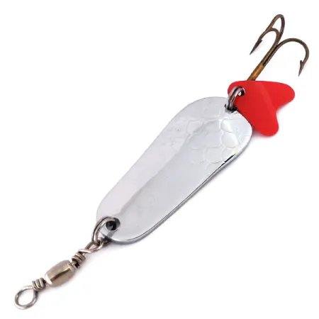Klassinen vasaroitu nikkelipinta viimeistelee tämän vuosisadan puolivälin lusikkauistimen etupuolen, joka on suunniteltu heijastamaan valoa murtuvina kuvioina pinnan alla. Painoltaan 16g (3/5oz) ja pituudeltaan 4,7cm (1 3/4") oleva viehe on tunnistettavan pisaranmuotoinen, ja sen sileään kääntöpuoleen on leimattu ikoninen "Shakespeare"-teksti. William Shakespeare Co:n Kalamazoossa, Michiganissa valmistama tuote (tuotekoodi 10213) edustaa kalastusvisionääri William Shakespearen vuonna 1897 perustaman yrityksen perintöä. Yksilö on 5/5-kunnossa, siinä on loistava metallinen kiilto ja puhtaat koukut. Näkyvyyden parantamiseksi takaosan uistinrenkaaseen on kiinnitetty kirkkaanpunainen sydämenmuotoinen muovinen houkutuslevy terävän pronssatun kolmihaarakoukun viereen. Keulaan on tehdasasennettu kestävä tynnyrileikari, joten uistin on valmis liitettäväksi perukkeeseen tai siimaan.